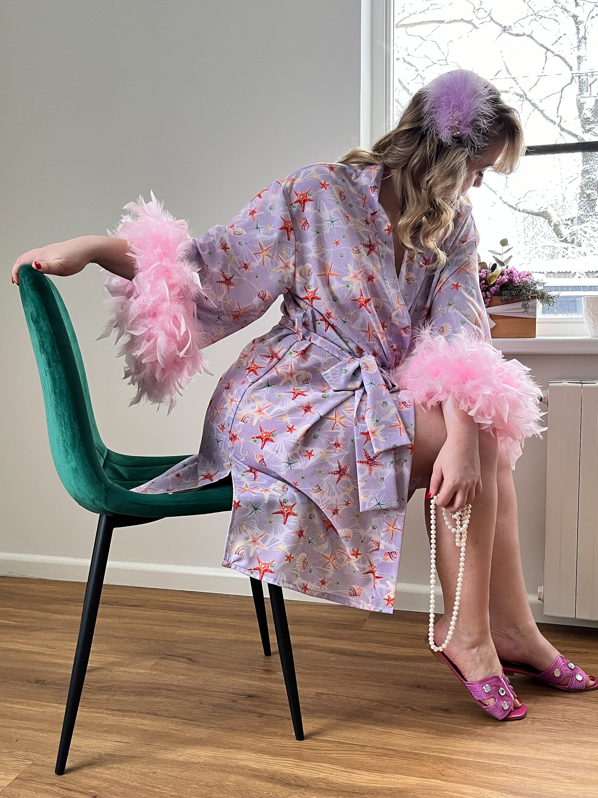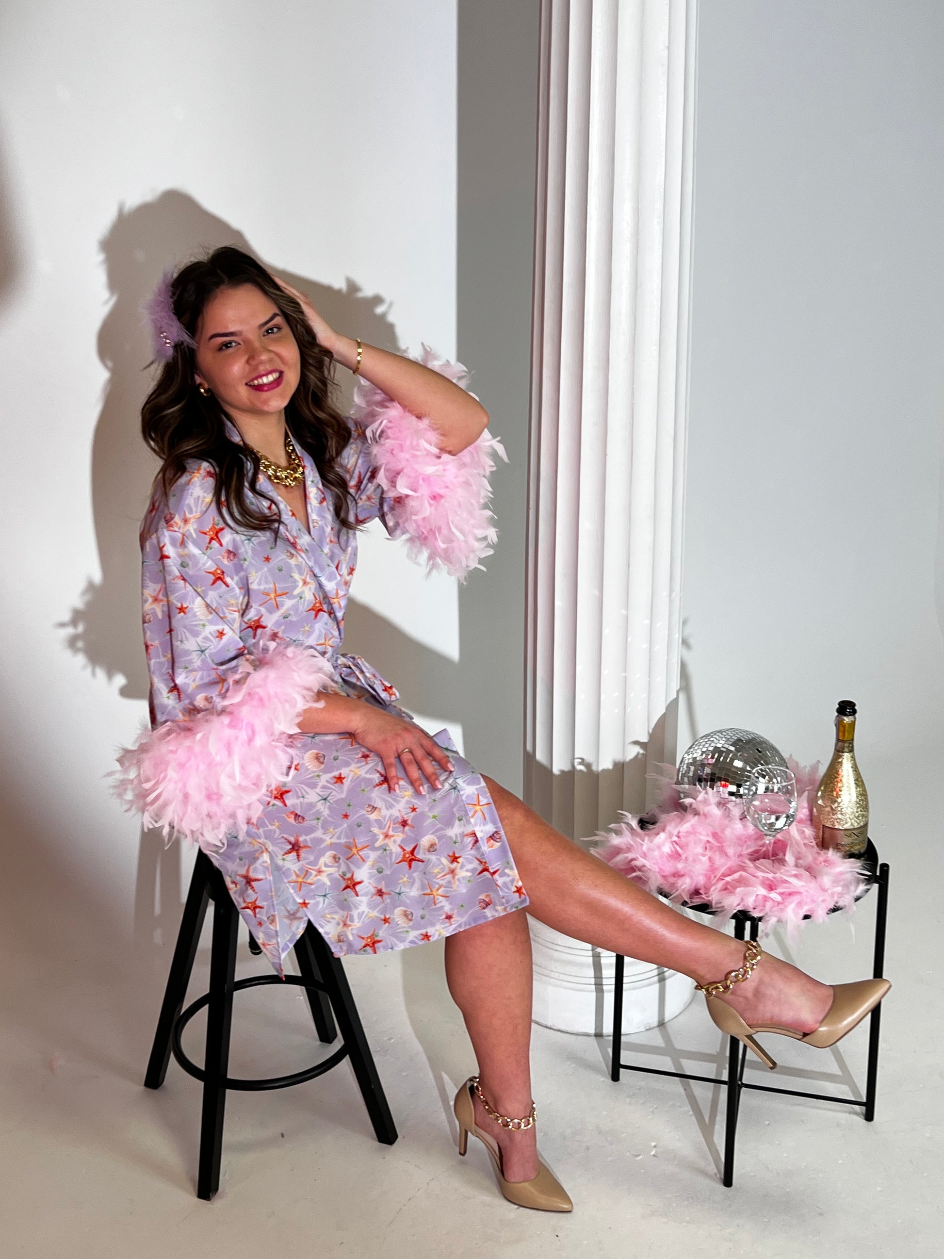 The robe features an intricate, refined print, adding a touch of artistry to its graceful silhouette. A self-tie belt cinches the waist, while the 3/4 sleeves 3/4 sleeve with rich ostrich feather trim offer both coverage and sophistication. Perfect for weddings, special occasions, or indulgent everyday moments.
